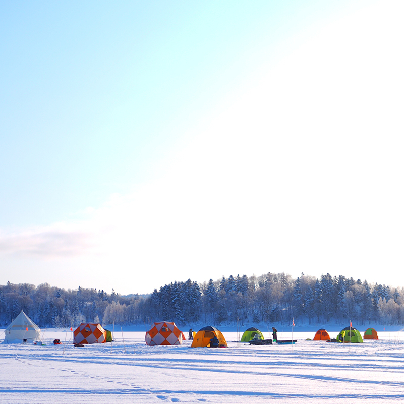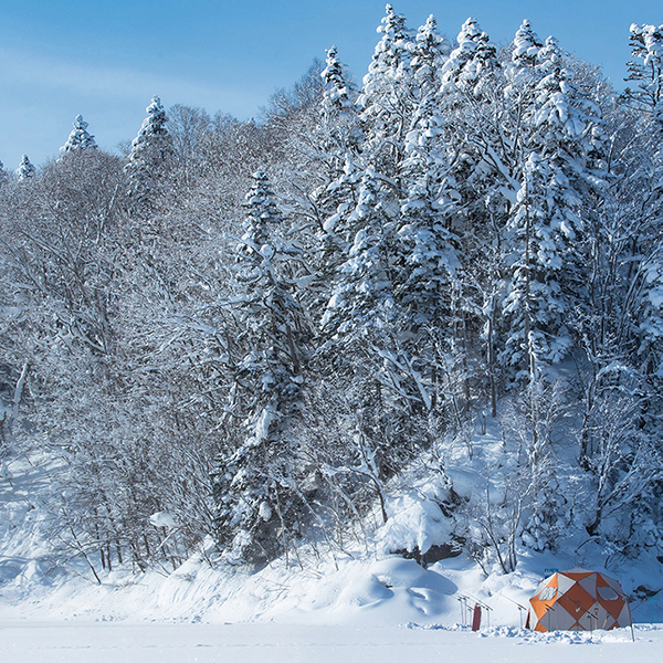 夏日本最大級の人造湖である“朱鞠内湖”。湖面に輝く“ダイヤモンドダスト“や、天空まで伸びる光の柱“サンピラー“など、氷点下30℃に達する銀世界は想像を超える非日常空間です。アクセスが容易でないことから、まだ多くの人に知られていない秘密スポットの一つ。広大な北海道の中でも圧倒的と言える大自然。朱鞠内湖は訪れる人の心を感動させる景勝地です。純白の湖面上で行う“ワカサギ釣り”が冬の朱鞠内湖おススメの体験メニュー。朱鞠内湖のワカサギは誰もが認める一級品です。初心者でも安心のレンタル品も充実。釣ったワカサギを町内の蕎麦屋さんで天ぷらにしてくれる特別ツアーです。