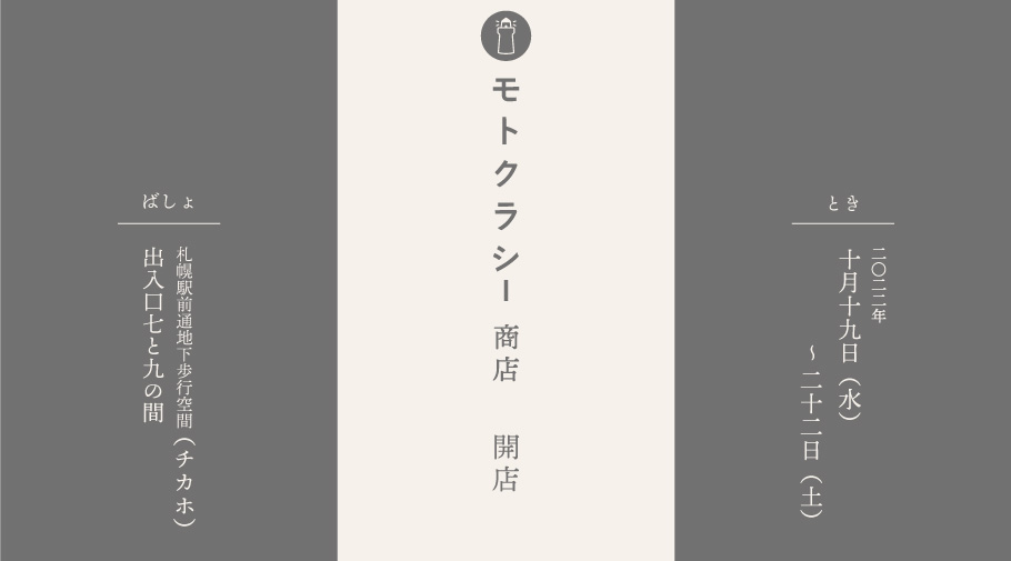 今年の7月に初めて「モトクラシー商店」をオープン。お客さん来てくれるかなと不安でしたが、たくさんの方にご来店いただきまして、本当にありがとうございました!第2回目はあるのかしら…?と思っていましたが、この度、kurache(クラシェ)様からお誘いいただき、またまた札幌駅前地下歩行空間に出店いたします。今回のクラシェさんのテーマは「秋まんぷく」。私たちが思う、まんぷくアイテムをたくさん持って参上しますよ。皆さまのお越しを心よりお待ちしております。