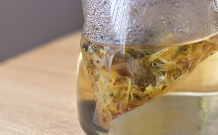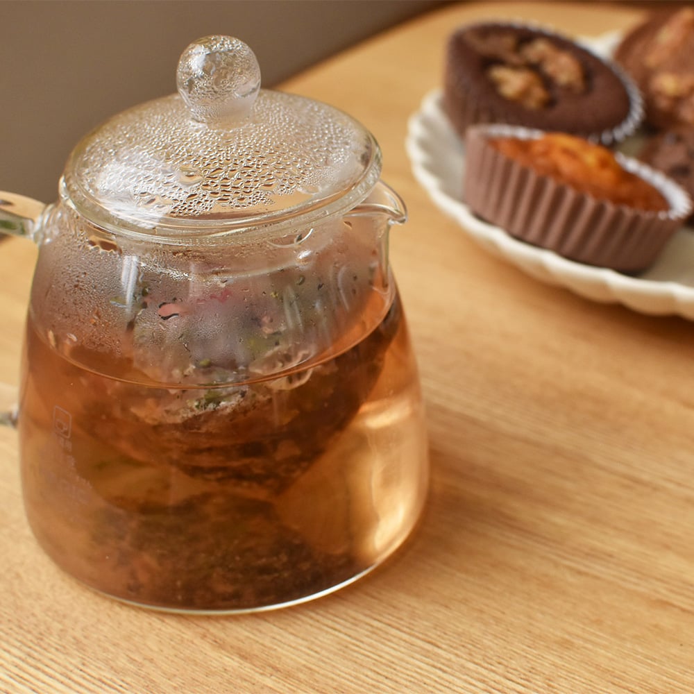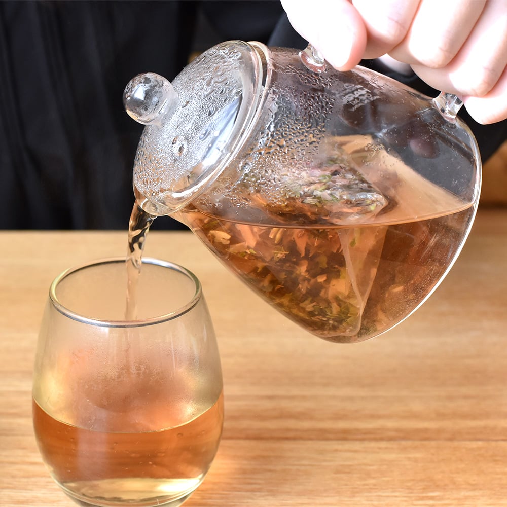 ガラスのポットでハーブティーを淹れると、乾燥した茶葉が花開く様子を見ることができます。