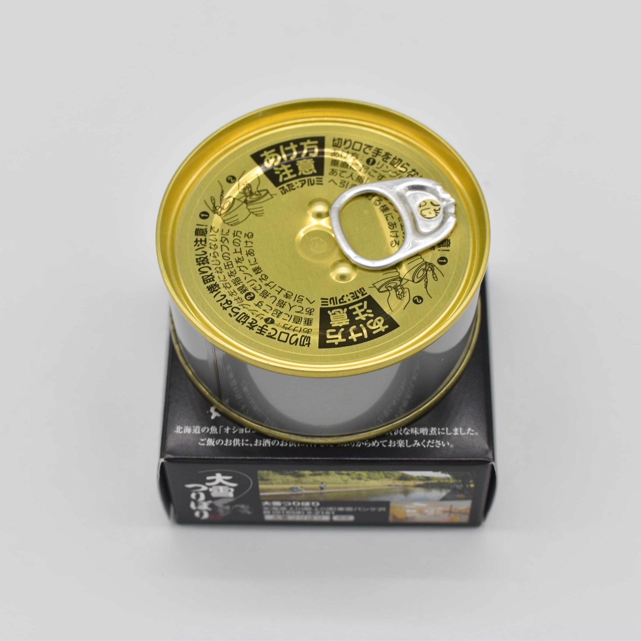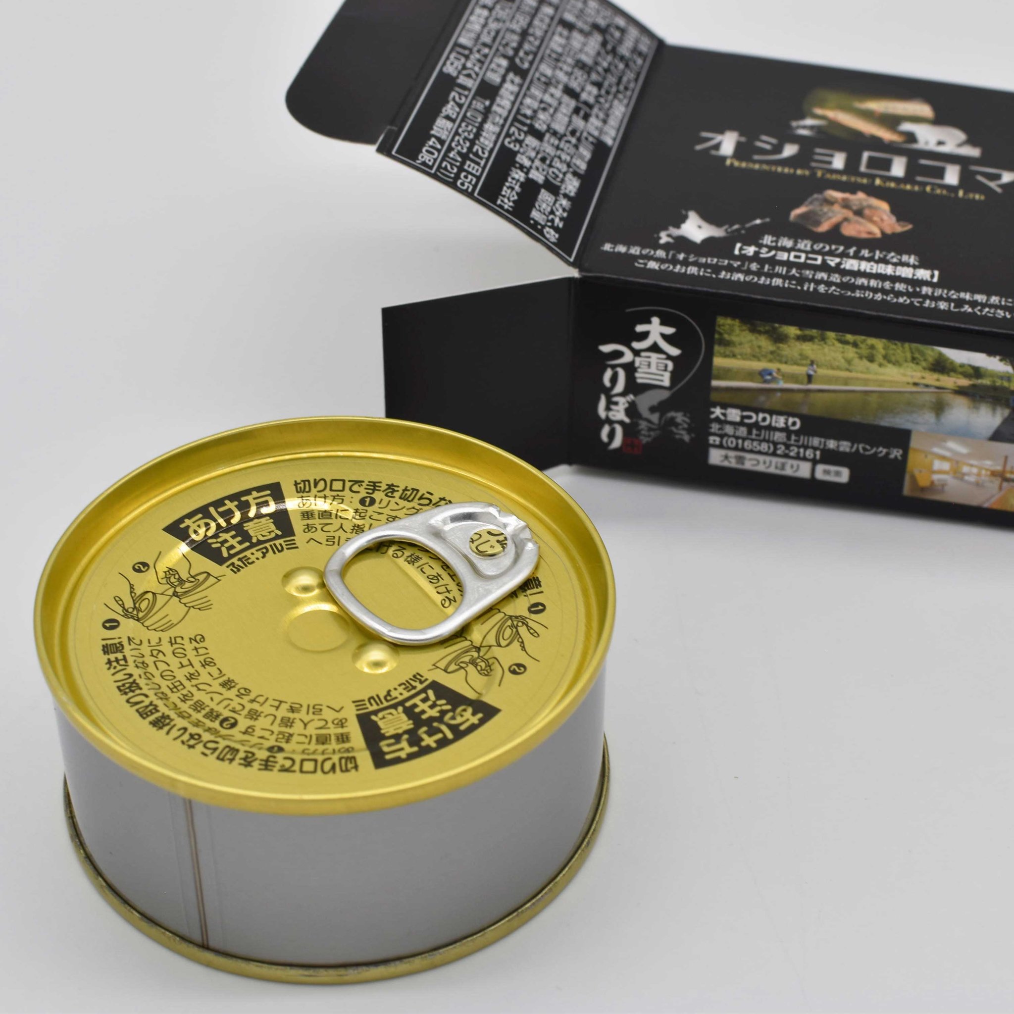 注文するとお家に届くのは、オショロコマ酒粕味噌煮缶詰4個セット。