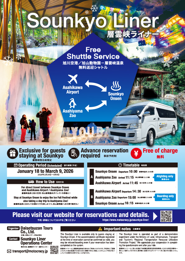 <Sounkyo Onsen Guests Only> We are operating a limited-time scheduled bus service connecting Asahikawa Airport, Asahiyama Zoo, and Sounkyo Onsen. Customers planning a trip to Sounkyo Onsen are encouraged to take advantage of this opportunity. ※Please make reservations at least one day in advance.