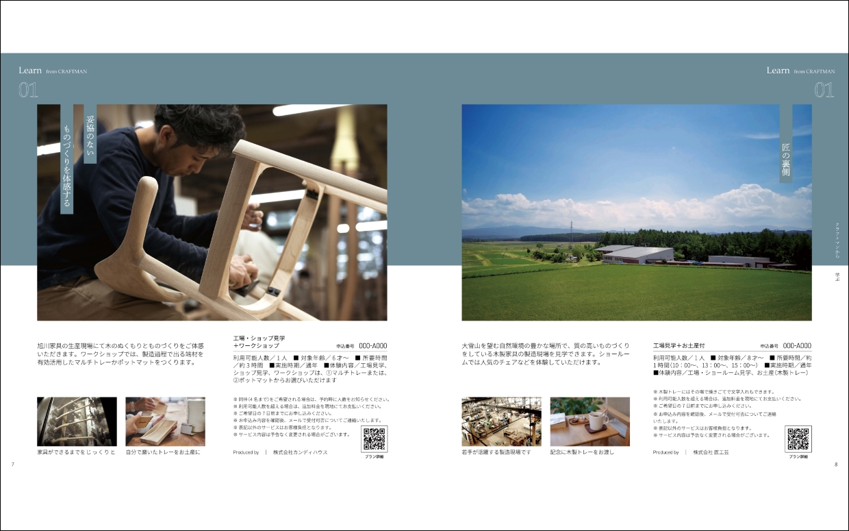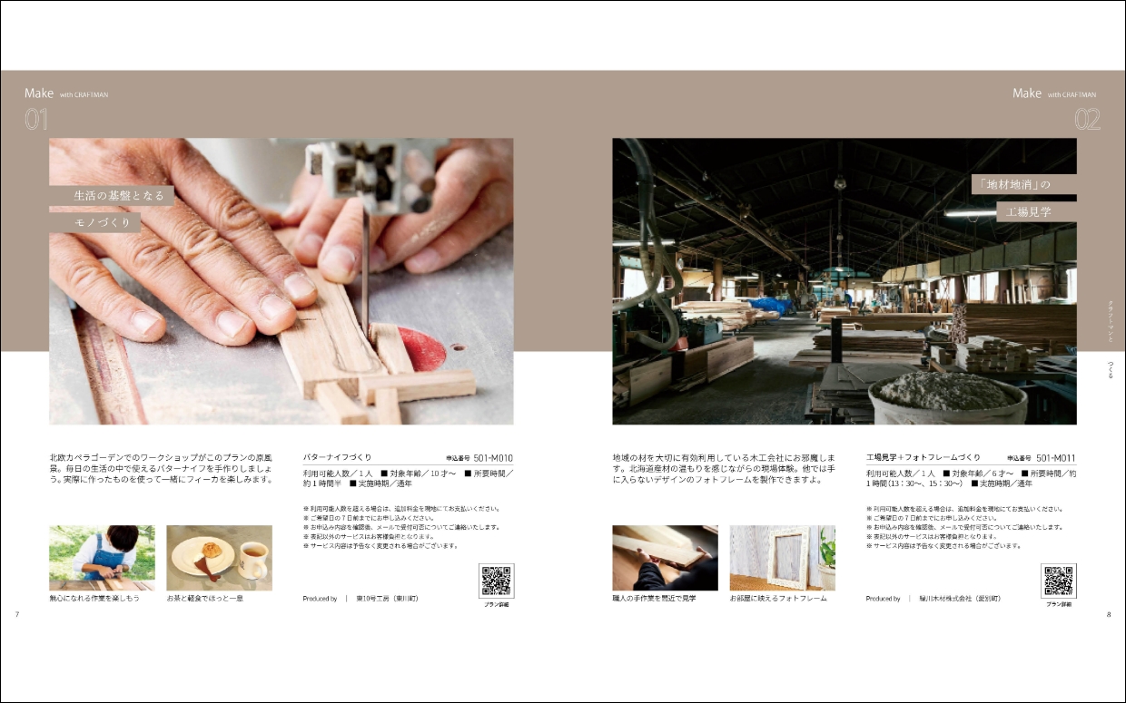 WORKS · 2024/01/31 体験型カタログギフト「TAISETSU TIME」制作 大雪カムイミンタラDMO様の体験型カタログギフトを制作させていただきました。 北海道の大雪エリア(愛別町・旭川市・上川町・鷹栖町・当麻町・美瑛町・東神楽町・東川町・比布町)の自治体や事業者と協力し、全52プランがぎゅっと1冊にまとまっています。 カタログギフトのテーマとして「クラフトマン」を提案。エリア内のクラフトマンの元へ、足を運び取材や撮影を行いました。 クライアント:大雪カムイミンタラDMO 実施メンバー お仕事のご相談はこちら tagPlaceholderカテゴリ: メディア, ツーリズム