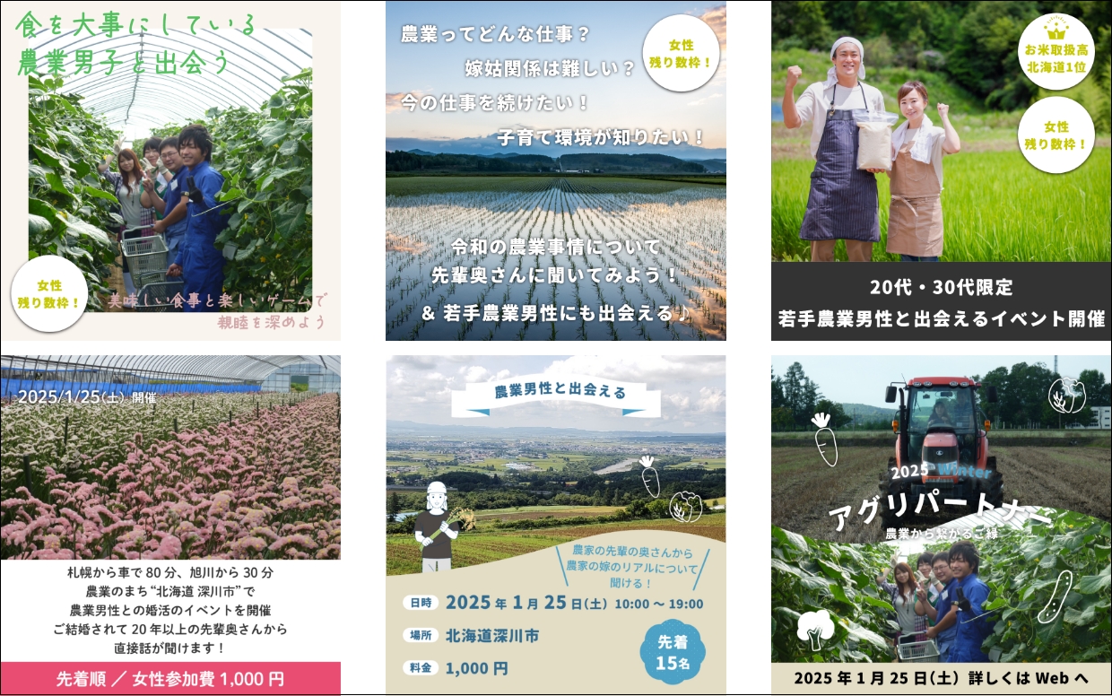 WORKS · 2025/01/25 アグリパートナー 募集業務・当日運営 JAきたそらち様から、若手農家の婚活事業「アグリパートナー」の参加者募集業務の委託を受けました。 SNS広告を中心に情報発信を行い、当日のイベント内容に関しても企画・提言で運営をサポート。 何度も現地で打合せを重ね、当日はゲームの司会進行まで行わせていただくことに(!)無事にカップル成立まで導くことができました。 クライアント:JAきたそらち 実施メンバー お仕事のご相談はこちら tagPlaceholderカテゴリ: ツーリズム